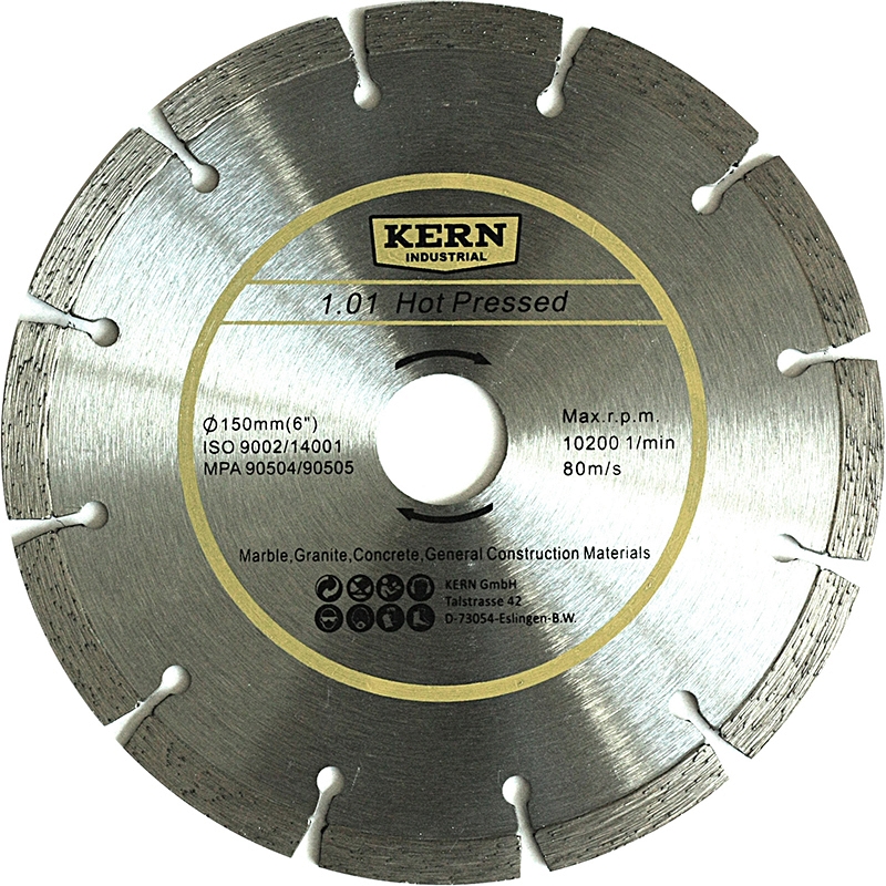 Алмазный диск Kern 1.01 Hot Pressed 115 мм (Керн 1.01 Хот Прессед 115 мм) – отрезной сегментный алмазный круг для сухой алмазной резки бетона, гранита, мрамора, а также армированного бетона (железобетона), мостового бетона, старого бетона, полимерного бетона, промывного бетона, бетонных блоков, спрессованного силикатного кирпича, глиняного кирпича, базальта, габбро, сланца, порфира, дорожного клинкера, твердообожженого клинкера, бордюрного камня, твердого камня, натурального камня (гранита, гнейса и т.п.), искусственного камня, тротуарной плитки, известняка (мрамора, терраццо и т.п.), гончарных материалов, шифера, голландской черепицы, серого чугуна, гипсокартона, керамических стекловидных труб, стеклопластика, твердых огнеупоров и других общестроительных материалов. Применяется на отрезных и ручных углошлифовальных машинах (УШМ).