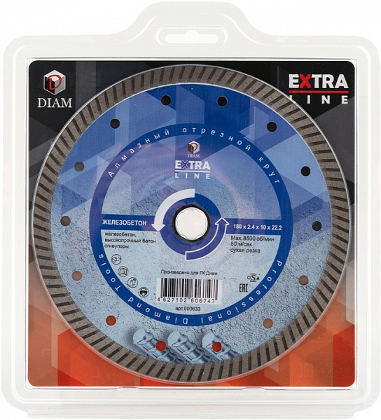 Алмазный отрезной круг Diam Extra Line Turbo Железобетон 180 мм (Диам Экстра Лайн Турбо Железобетон 180 мм) – профессиональный алмазный диск тип Turbo для сухой резки высокоармированного бетона (железобетона), высокопрочного тяжелого мелкозернистого бетона, кирпича, клинкера и других огнеупоров.