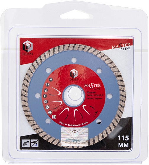 Алмазный отрезной круг Diam Master Line Turbo Master 115 мм (Диам Мастер Лайн Турбо Мастер 115 мм) – профессиональный алмазный диск для сухой резки бетона, слабоармированного бетона, огнеупоров, кирпича, тротуарной плитки, общестроительных материалов.