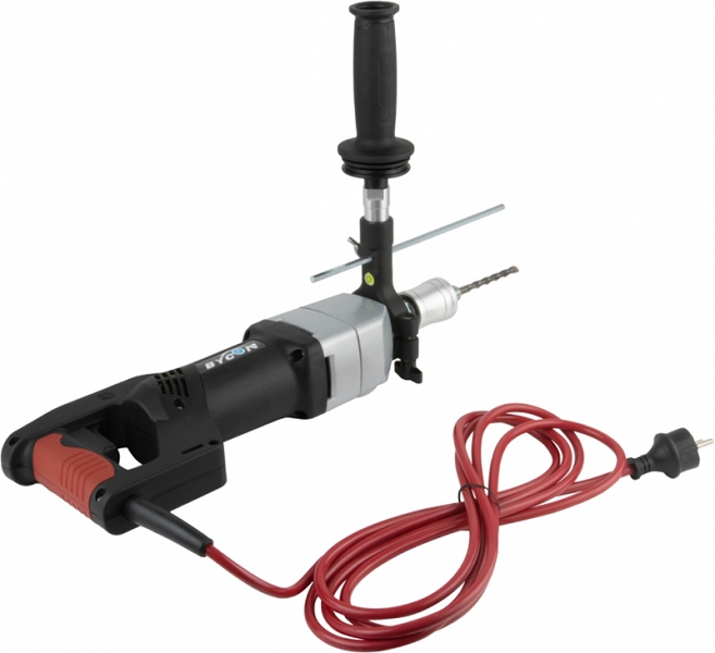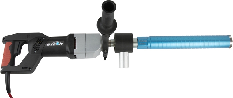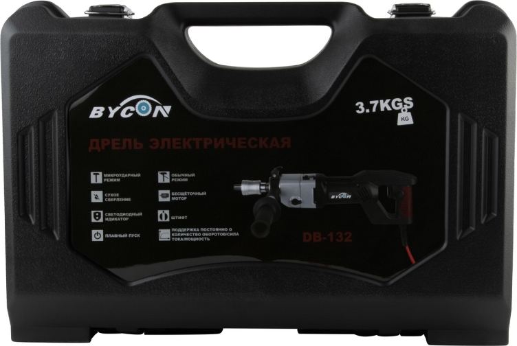 Бесщеточная дрель для сухого алмазного сверления с микроударом Bycon DB-132 (Байкон ДБ-132) – алмазная дрель с микроударом для сухого алмазного бурения отверстий Ø 10 – 102 мм в бетоне, железобетоне, "легком" бетоне, шлакобетоне, кирпиче и других особенно твердых материалах при высокой рабочей скорости;  как с использованием станины, так и "с рук"; для профессионального использования. Отличный вариант как для монтажников кондиционеров, так и для электриков. С дополнительными переходниками позволяет работать как алмазными коронками стандартной длины, так и коронками для подрозетников.