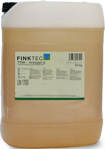 Дезинфицирующее средство Finktec FINK-Antisept G (Финктек ФИНК-Антисепт Г) – эффективное, бактерицидное, фунгицидное дезинфекционное средство на основе различных четвертичных аммонийных соединений с оптимально подобранным уровнем pH, предназначенное для эффективной дезинфекции всех пищевых производств и обладающее бактерицидным, фунгицидным действием, имеет нейтральный запах, не корродирует с поверхностями и легко смывается.