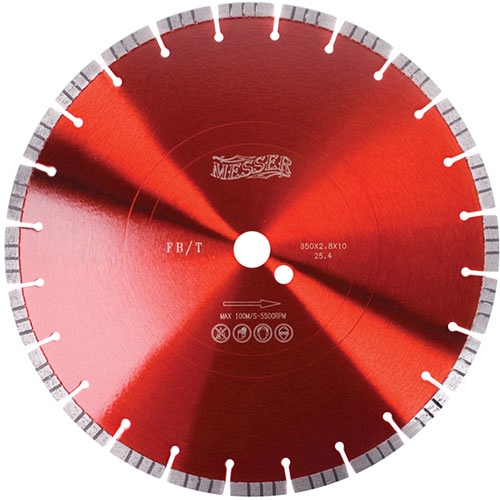Диск алмазный отрезной Messer FB/T (Мессер ФБ/Т) с алмазным турбосегментом предназначен для резки высокоармированного (сильноармированного) железобетона, бетона, кирпича, каменной кладки, гранита, мрамора с применением охлаждающей жидкости и без нее. Идеально подходит для работы на бензорезах, уменьшая нагрузку на оператора, а также штроборезах, электрических резчиках, швонарезчиках, камнерезных станках, плиткорезах электрических и другой алмазной технике.