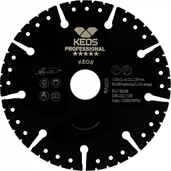 Диск алмазный универсальный Keos Professional 125 мм (Кеос Профессионал 125 мм) предназначен для резки металлов, пластика, резины, бетона, армированного бетона (железобетона), кирпича, древесины и т.д. ушм (болгарками), штроборезами, системами резки крупноформатной плитки, как с подачей воды, так и всухую. Подходит для универсального использования, аварийно-спасательных работ и многого другого.