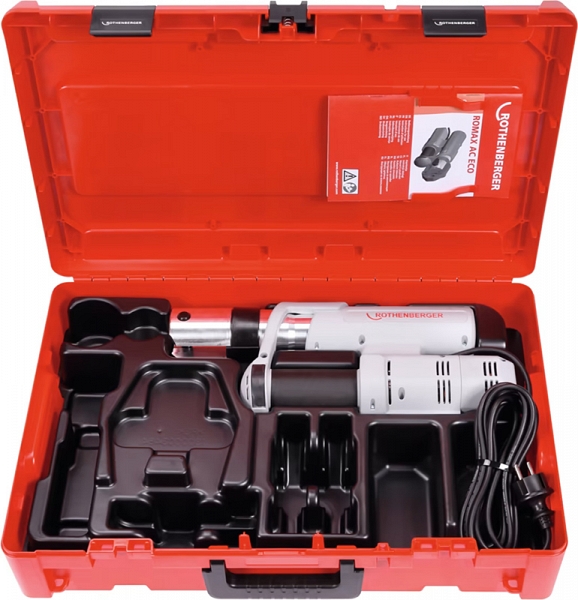 Электрический гидравлический радиальный пресс для обжима фитингов Rothenberger Romax AC Eco Basic (Ротенбергер Ромакс АЦ Эко Бейсик) – электрогидравлический пресс-инструмент для работы от сети для обжима пресс-фитингов в зависимости от пресс-системы труб Ø 12 – 110 мм с усилием 32 – 34 кН.