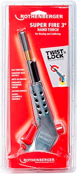 Модель снята с производства! Газовая горелка с пьезоподжигом на баллончик для пайки Rothenberger Super Fire 3 Basic Set (Ротенбергер Супер Файер 3 Бейсик Сет) – мощная эргономичная ручная горелка для пайки труб Ø до 28 мм твердым припоем и Ø до 35 мм мягким припоем, а также для других целей.