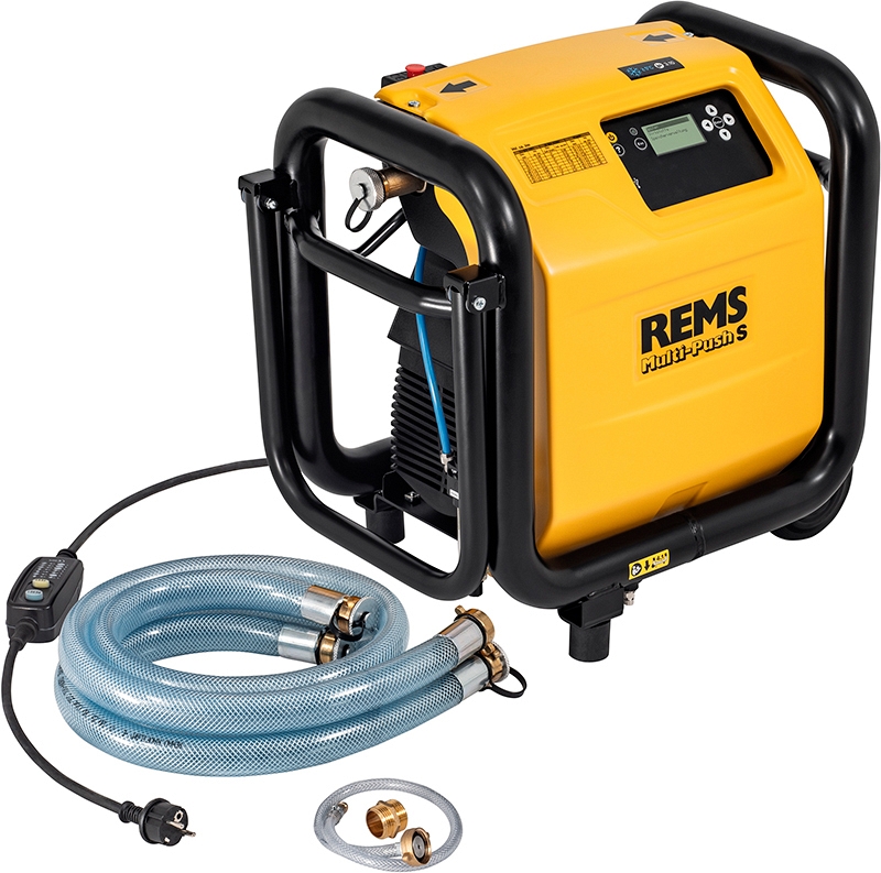 - Rems Мульти-Пуш S Сет. Электронное устройство для промывки с безмаслянным компрессором. Для промывки водой или водовоздушной смесью, дезинфекции, очистки, консервации систем трубопроводов, например, для удаления шлама, очистки и консервации систем радиаторного и панельного отопления, промывки и дезинфекции сантехнического оборудования питьевого водоснабжения, а также для эксплуатации пневматических инструментов ≤ 230 Нл/мин. Блок ввода и управления. Поршневой компрессор с рычажным приводом, конденсаторный двигатель 230 В, 50 Гц, 1500 Вт. Выключатель индивидуальной защиты (PRCD). Передвижной каркас из стальных труб. Крышки для входных и выходных водопроводных штуцеров. 2 шт. всасывающих и напорных шланга D 1", с тканевой вкладкой, длиной 1,5 м, со шланговыми резьбовыми соединениями 1" и крышками. Шланг для соединения компрессора и патрубков подключения к водопроводу, длина 0,6 м, с быстроразъемным соединением DN 7,2 и шланговым резьбовым соединением 1", двойной ниппель 1", для продувки остатков воды из компрессора и всасывающих / напорных шлангов после завершения работы. Без устройства для дезинфекции, без устройства очистки и консервации.