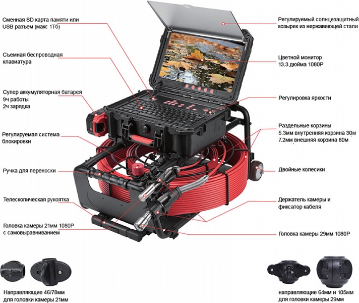 - Головка камеры Ø 29 × 50 мм, 1080Р (1920 × 1080), 12 / 15 × LED, с функцией самовыравнивания