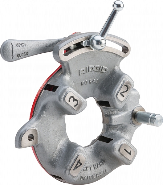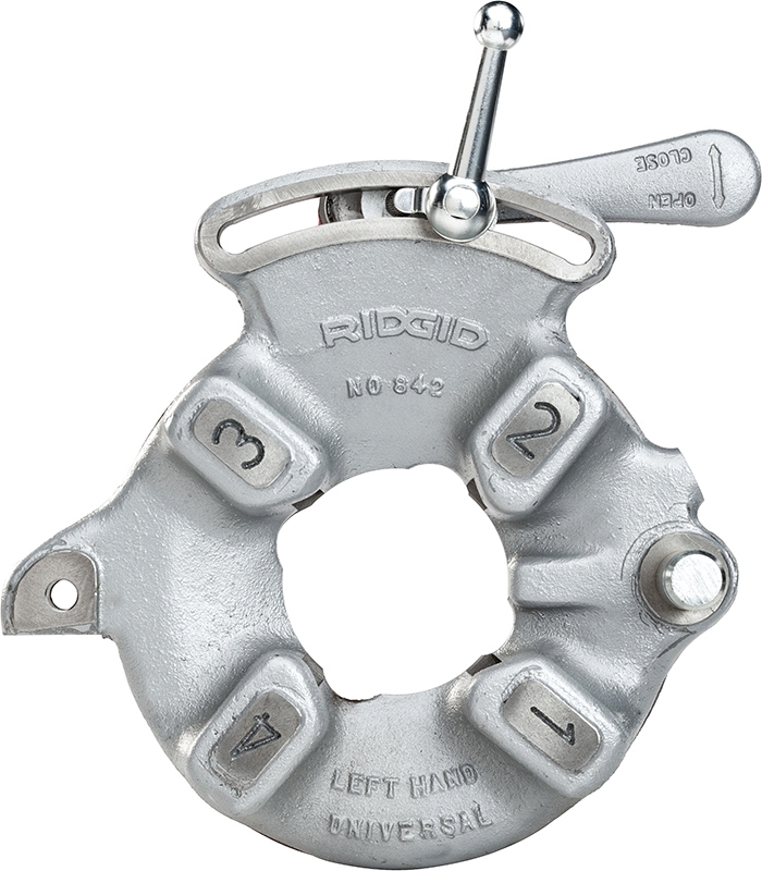 Ручная резьбонарезная голова для станка Ridgid 842 NPT L (Риджид 842 НПТ Л) предназначена для нарезки левой трубной конической резьбы NPT L на трубах Ø 1/8" – 2" (6 – 50 мм) на резьбонарезных станках Ridgid 300, 300 Compact, 300-A с кареткой, 535, 535А, 1233 и других производителей в промышленной отрасли.