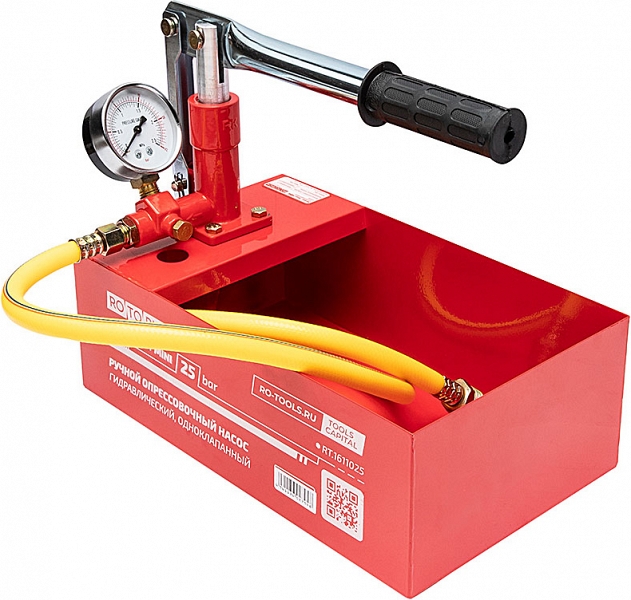Ручной опрессовщик Rotorica Rotor Test Mini (Роторика Ротор Тест Мини) – компактный одноклапанный испытательный насос для проверки на герметичность и гидравлических испытаний давлением до 25 бар небольших систем отопления, водоснабжения, резервуаров и т.д., быстрой ручной опрессовки систем отопления, проверки на утечку отопительных и воздушных контуров, холодильных систем, масляных и спринклерных систем и многих других трубных установок, для бытового применения.