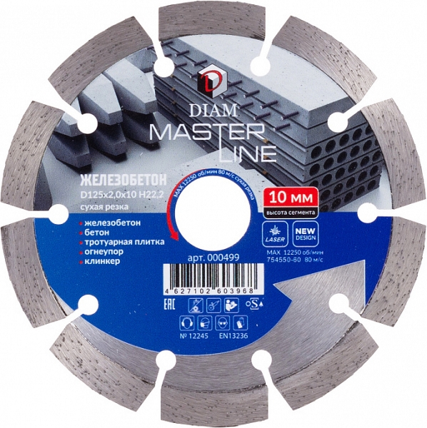 Сегментный алмазный круг Diam Master Line 1A1RSS Железобетон 125 мм (Диам Мастер Лайн 1А1РСС Железобетон 125 мм) – профессиональный алмазный отрезной диск для сухой резки бетона, армированного бетона (железобетона), тротуарной плитки, кирпича, клинкера, огнеупоров и других строительных материалов, схожих по характеристикам, на углошлифовальных машинах (ушм, болгарках), штроборезах, системах резки крупноформатной плитки, плиткорезах электрических и другом оборудовании, с подачей и без подачи воды.