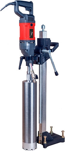 - Каретка перемещается по стойке вручную через пару "шестерня-зубчатая рейка", имеет регулируемые уголки из латуни, которые обеспечивают плавное скольжение и легкую подачу алмазной коронки