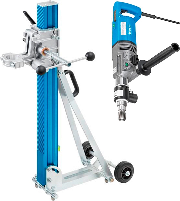 Установка алмазного бурения с микроударом Baier BDB 829/BST 200 (Байер БДБ 829/БСТ 200) с функцией мягкого удара предназначена для точного ручного и наклонного, высокоточного, колонкового (корончатого), стационарного (со станиной) сухого сверления отверстий Ø 42 – 250 мм в бетоне, железобетоне, камне, кирпиче, под углом до 45°, без подачи воды.